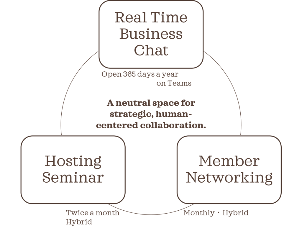 The philosophy of this consortium is “A neutral space for strategic, human-centered collaboration”. It is operated by SASAL, Inc., which serves as a neutral space provider for all participating companies. Regardless of company size or industry, we promote equal collaboration and interaction, aiming to generate business synergies by leveraging each member’s unique strengths.